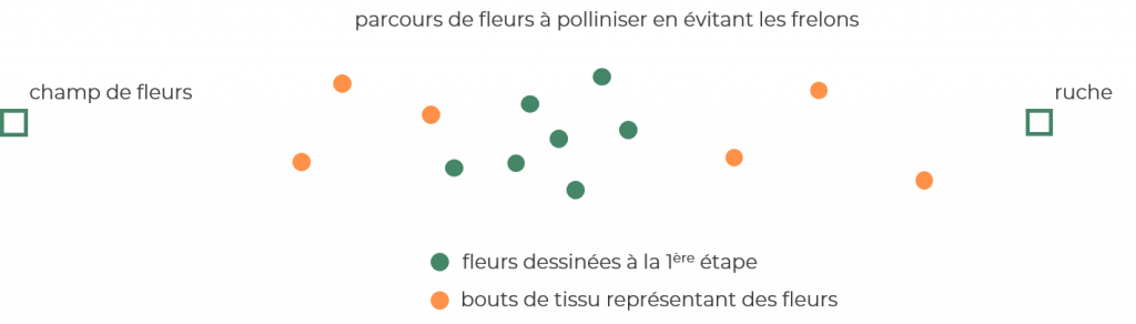 - traverser le terrain qui sépare la ruche des fleurs en évitant de se faire toucher par le frelon. Bien passer autour des fleurs du champ, symbolisées par les bouts de tissu et/ou les fleurs dessinées au sol ;